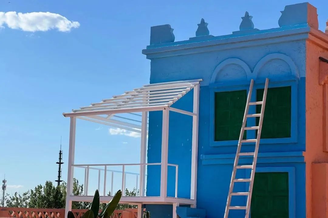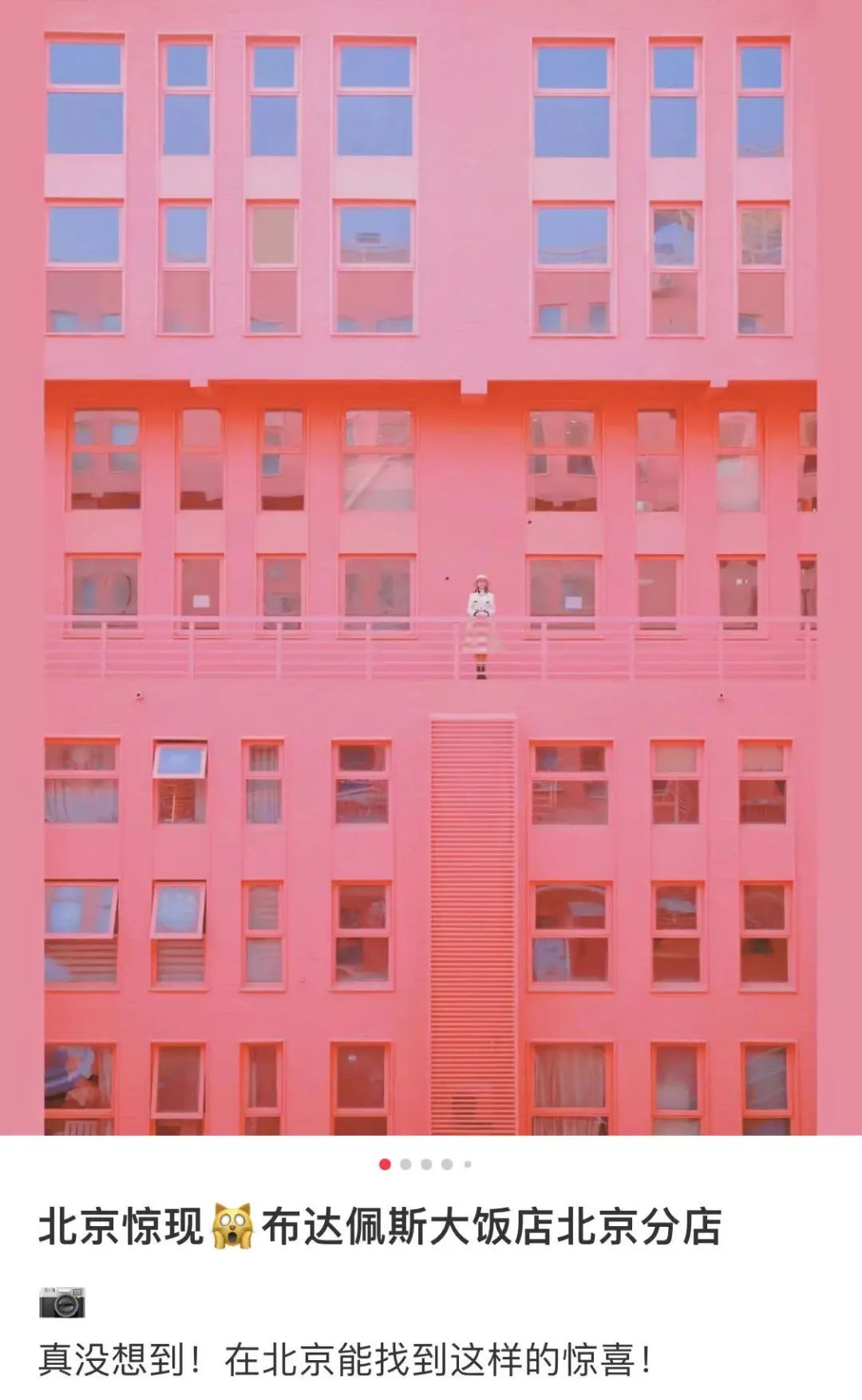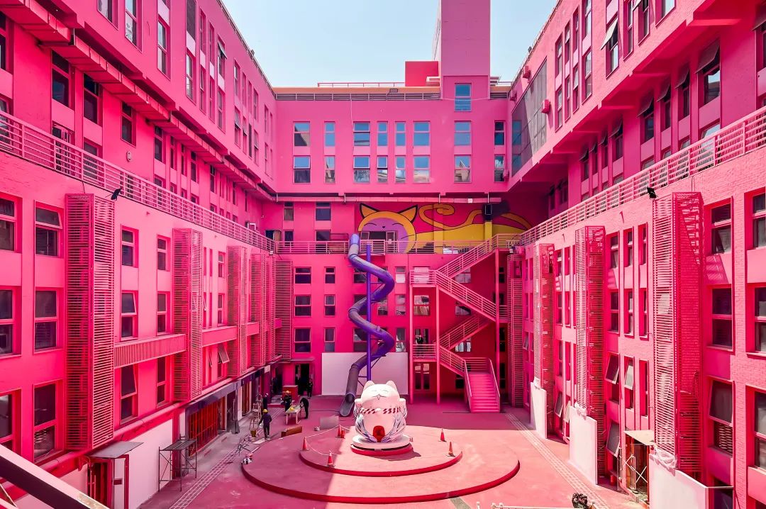 整个项目是由建筑群和中心露天广场组合而成,主打色系是源自于《布达佩斯大饭店》的粉色,同时搭配天空蓝和西域黄,一进入其中就仿佛就置身于电影中。