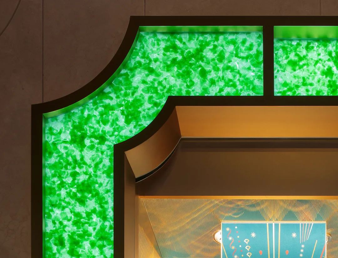 色彩设计取自于“宝格丽绿”,使用了绿色玻璃的回收材料制作而成,在造型上融合了上海独特的建筑风格,同时延续了宝格丽的品牌基因和上海的历史传统。