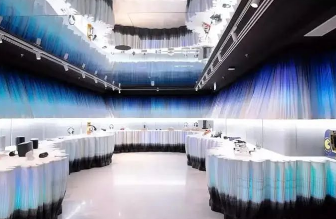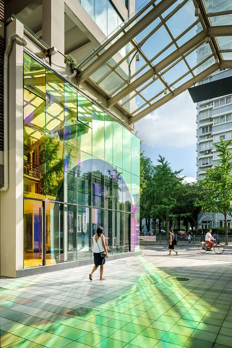 店铺门口为面积为127平方米的炫彩双层高外立面,是一层二向色薄膜,在阳光下能呈现出变化的色彩。
