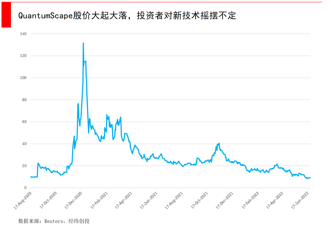 QS在一级市场十分受追捧,比尔盖茨曾经毫不犹豫地注资,大众汽车也为了押注未来,多次加码,拿到董事会席位,大众在2020年还追加2亿美元投资,以帮助QS预计在2025年建立固态电池量产生产线。