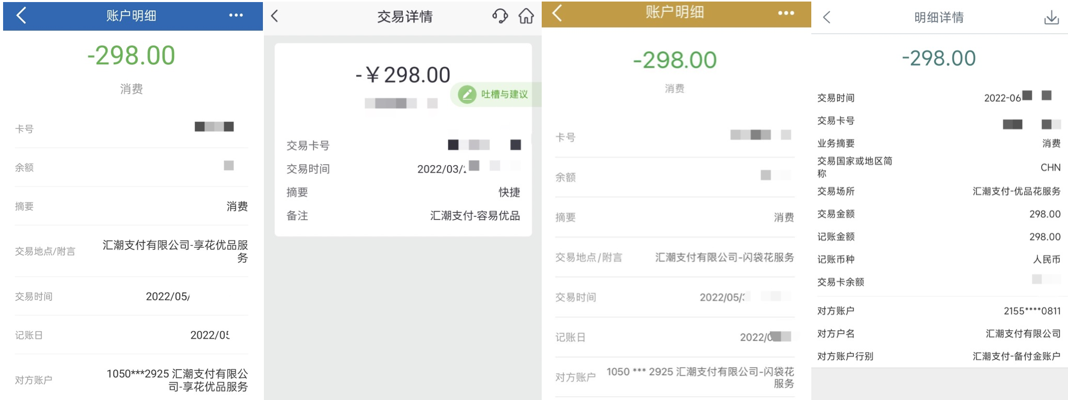 在黑猫投诉平台,仍陆续有汇潮支付的相关投诉被指无故扣款,关联的商家包括享花优品、闪贷花、微众花、乐享万卡等现金贷口子,投诉原因大多涉及会员扣款。