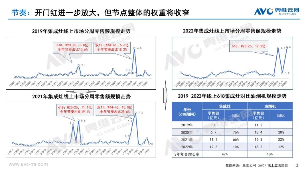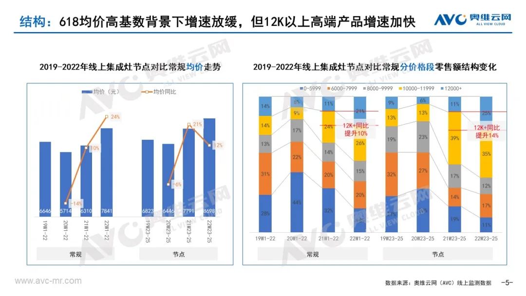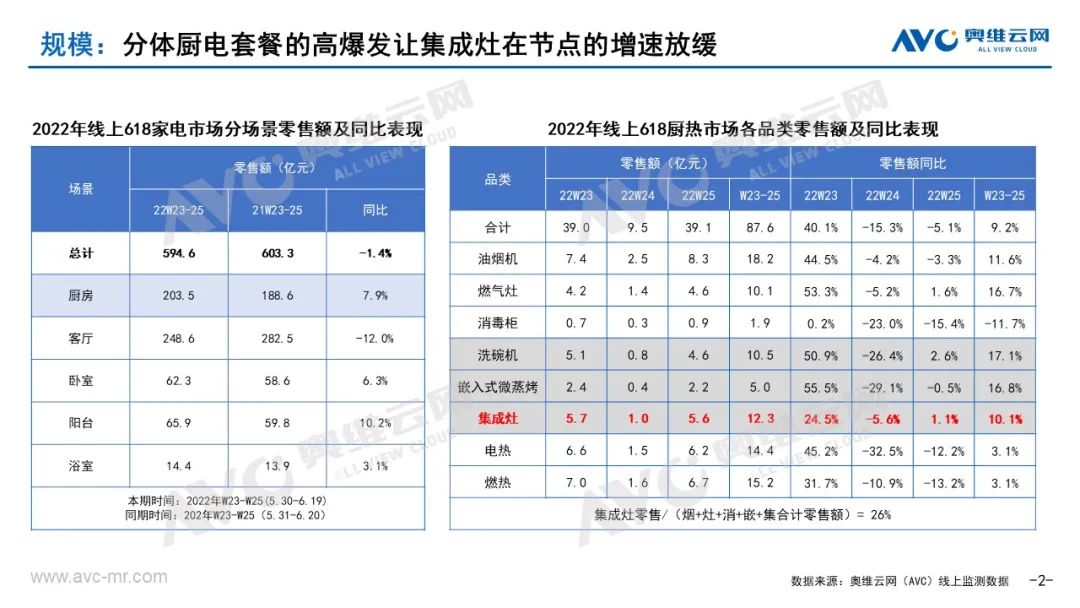 1、分体厨电套餐的高爆发对集成灶带来一定的影响。今年家电市场消费信心不足、消费水平不高的背景下,618更偏向于客单值更低的厨电两件套。据奥维云网(AVC)线上监测数据显示,2022年618期间(2022W23-25:5.30-6.19,同期2021W23-25:5.31-6.20)厨电套餐零售额17.8亿元,同比增长17.3%(对比W1-22同比下滑8.4%),集成灶12.3亿元,同比增长10.1%(对比W1-22同比增长15.5%)。(有关厨电套餐的具体内容详见《中国传统厨电618总结》)