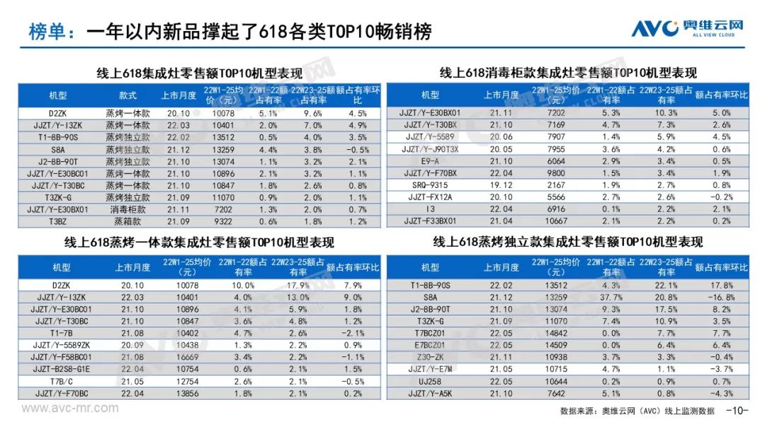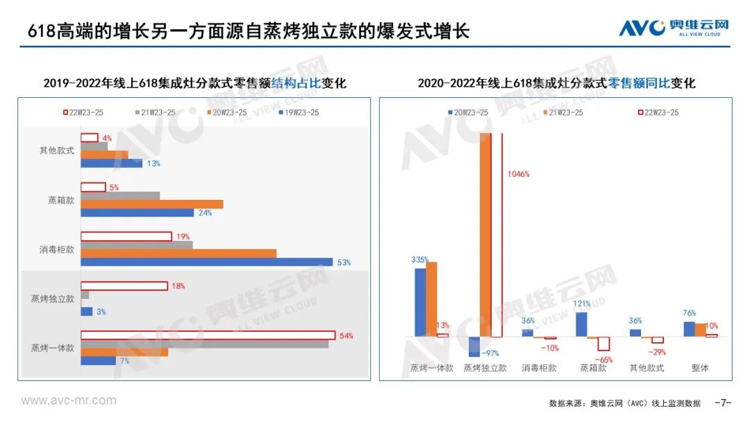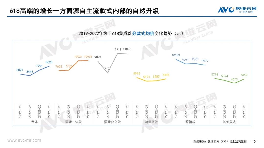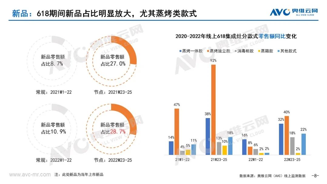 5、新品占比远超常规,接近30%。据奥维云网(AVC)监测数据显示,今年618期间集成灶线上市场新品零售额占比28.7%,远超常规时期(W1-22)的10.9%,且同比去年618也有提升。