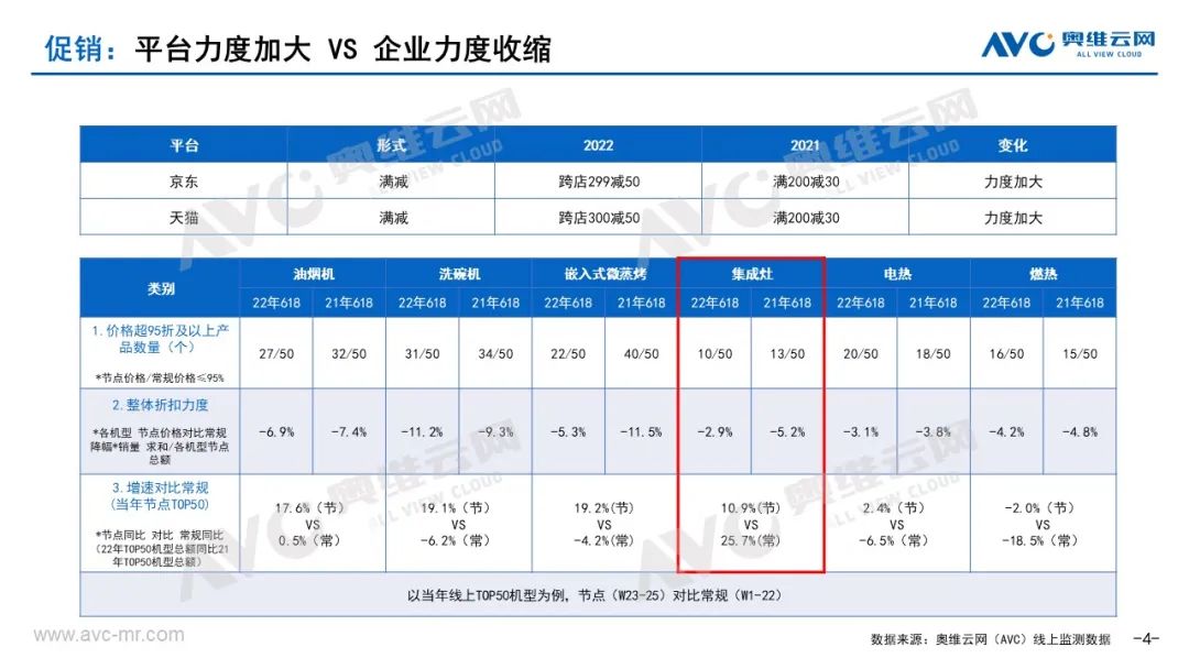 3、促销力度看,平台加大 VS 企业收缩。据奥维云网(AVC)监测数据显示,618期间线上市场厨电各品类95折机型数量同比去年明显减少,而洗碗机之外的大部分品类折扣力度同比均有收缩。其中,集成灶由于新品居多,去年618价格降幅为5.2%,今年仅为2.9%。(以618期间TOP50机型为例,具体计算方法详见报告)。