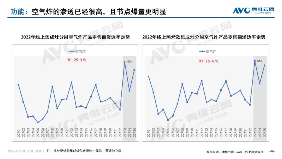 6、空气炸的渗透在节点进一步加速。据奥维云网(AVC)监测数据显示,今年618期间集成灶线上市场空气炸产品在集成灶整体中的零售额渗透率已经达到45%,远高于常规时期(W1-22)的21%。若只考虑蒸烤类集成灶(蒸烤一体款+蒸烤独立款),渗透率已经达到62%,同样远高于常规时期(W1-22)的34%。