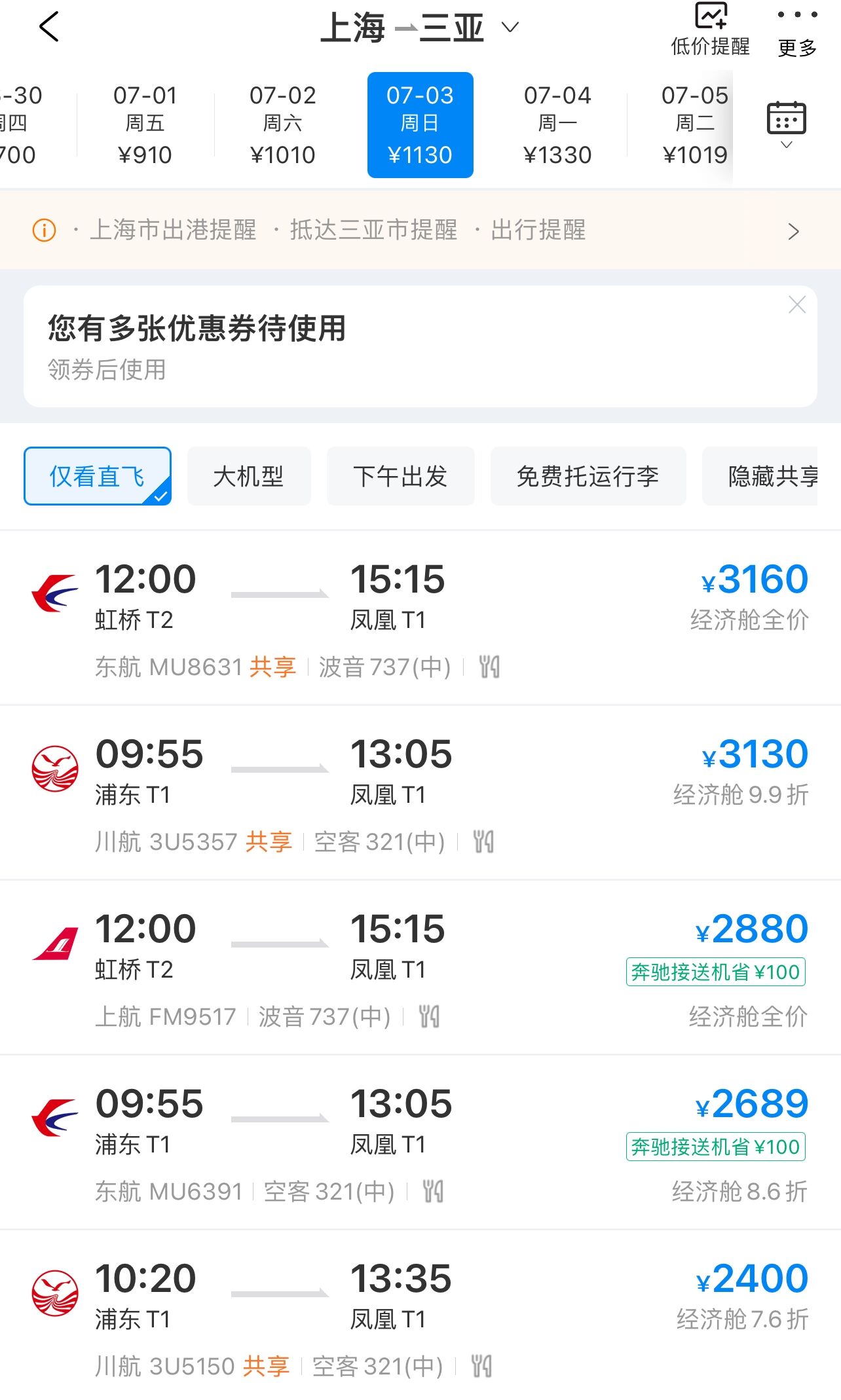 以7月3日为例,当天23趟直飞航班中,约有8趟航班票价都在7折以上,最高的为东航上海虹桥-三亚凤凰,仅剩全价经济舱可售,为3160元,公务舱/头等舱全价15640元,仅有余票3张;低成本航司春秋航空当天上海浦东-三亚凤凰的票价也在1130元以上。