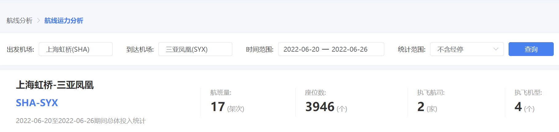 据航班管家“航线分析”统计,过去七天(6月20日-6月26日),上海虹桥-三亚凤凰航班量共计17架次,提供座位数3946个,执飞航司主要为吉祥航空及东航旗下上海航空。