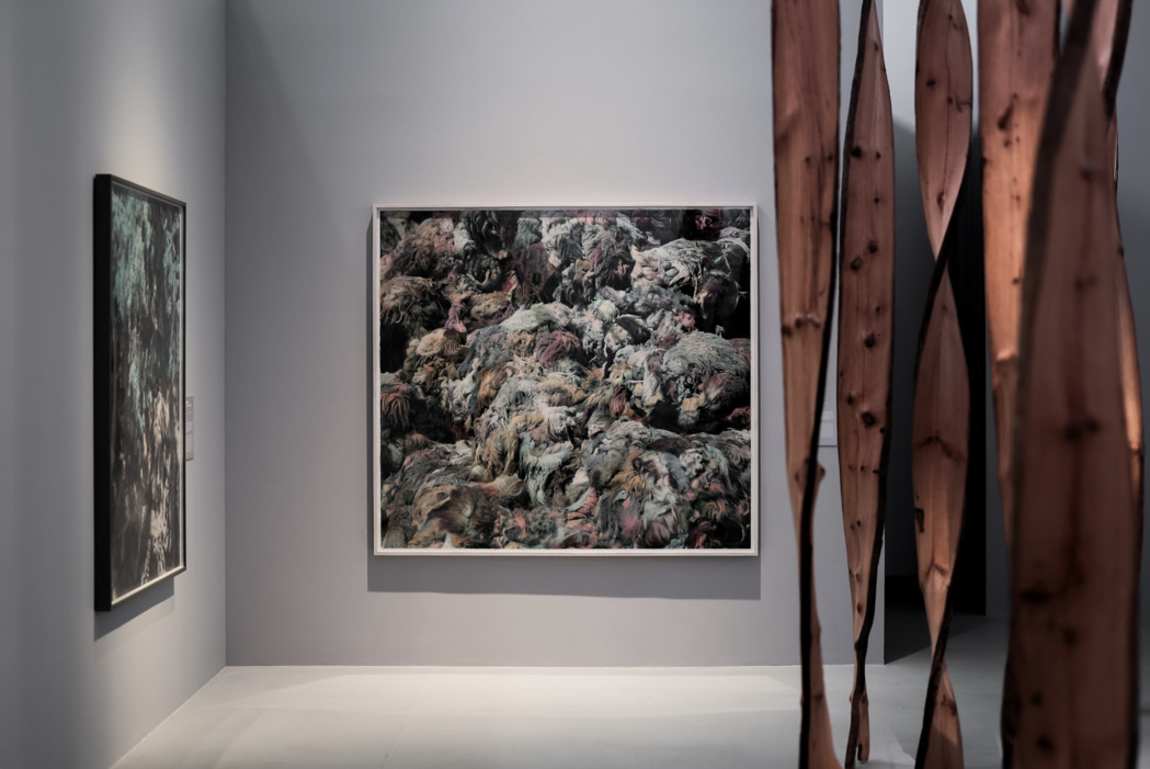 史国威在对谈中提到,自己作品的核心“没那么深奥”,甚至用一句话就可以概括:让那些最普通的、大家最容易忽略的事物变得丰碑化。人们看到这些尺寸巨大的作品时会有一种压迫感,但它们其实只是很普通的事物。比如拍摄于新疆阿勒泰地区的牧场的作品《羊毛》,羊毛是新疆最普通的东西,但是当它被收割成群,并充满整个画面,就会逼迫观众去重新审视它们,并无法再将其看成是平日熟视无睹的自然之物。而当摄影-绘画、自然-人为的分野被打破,我们会回到世界原本的状态中去,也就是一种迷人的混沌、一种中间状态。