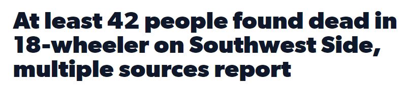 当地媒体KSAT电视台27日援引多个消息来源称,当地警方在一辆18轮货柜车内发现至少42具尸体,目前警方正在进行调查。根据现场图片,多辆警车,消防车和救护车已经抵达现场。