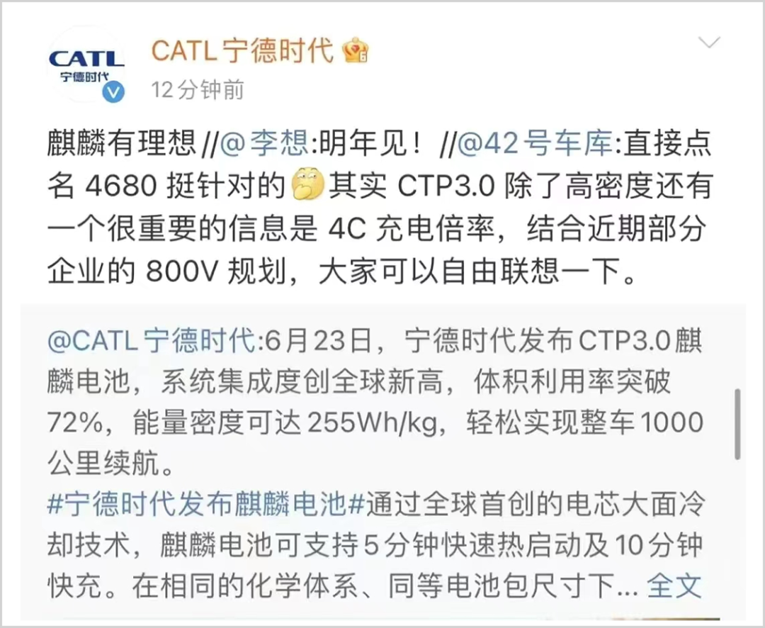 哪吒汽车官方微博则以“共赴山海”表达对麒麟电池的好感。