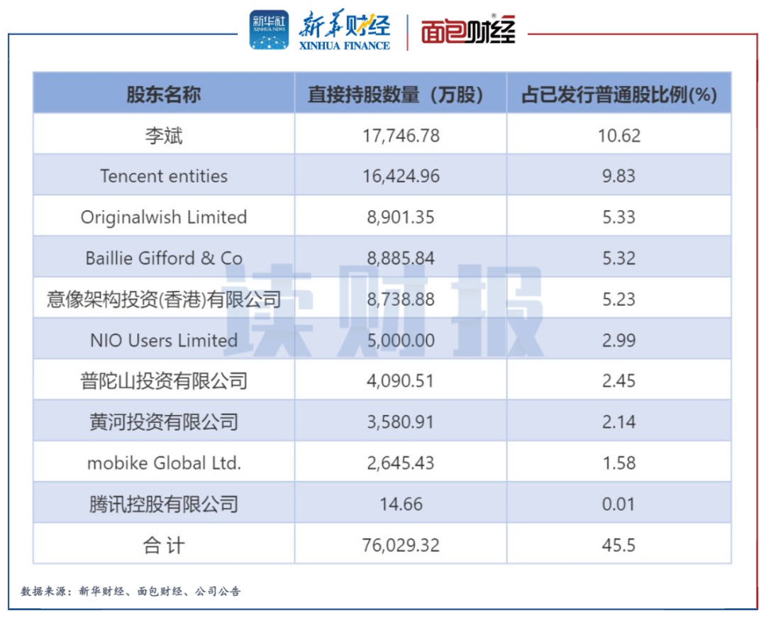 图7:截至2022年一季度末蔚来汽车的前十大股东持股情况