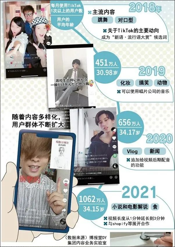 据悉,TikTok最早于2016年8月16日设立日本本地团队,开启了产品的本土化运作。2017年夏天,TikTok移动端正式登陆日本市场,之后迅速风靡。