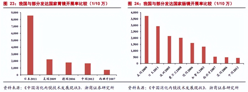 与此同时,和发达国家相比,中国内镜普及率明显偏低。2012年的时候曾有机构统计过,中国每10万人胃镜检查开展人数为1663.51例,而美国在2009年就已达到2234.82 例,中国每10万人肠镜检查开展率为435.98例,美国2009年就已达3724.70例,中国仅为美国的1/8。