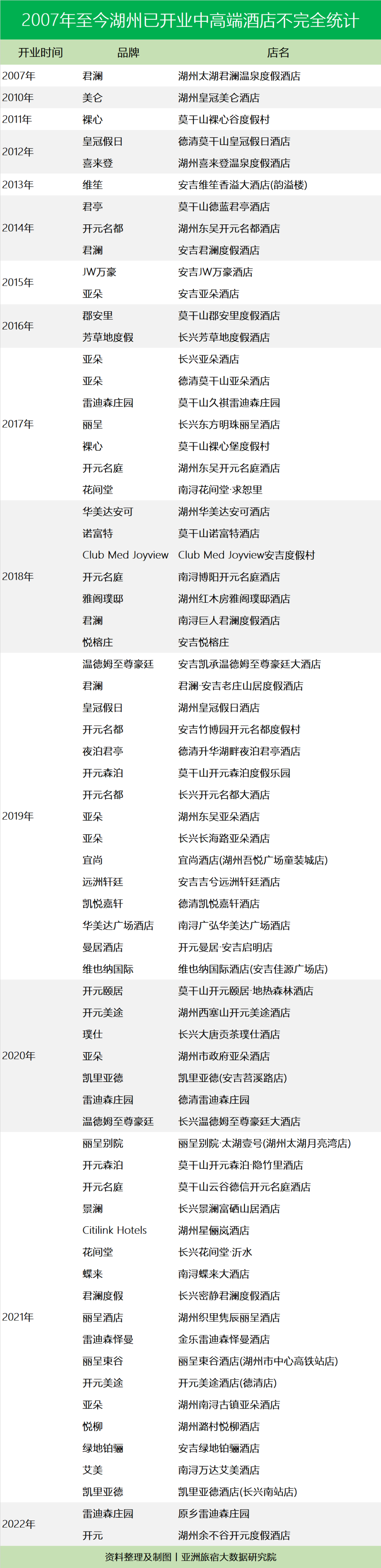 据亚洲旅宿大数据研究院不完全统计,自2007年至今共有26家酒店集团45个品牌在湖州布局共计68家中高端及以上酒店。其中,选择将首店或是意义重大的门店落子湖州的,不止是悦榕集团。还有万豪国际集团旗下的喜来登酒店和JW万豪酒店,凯悦酒店集团旗下的阿丽拉酒店等。