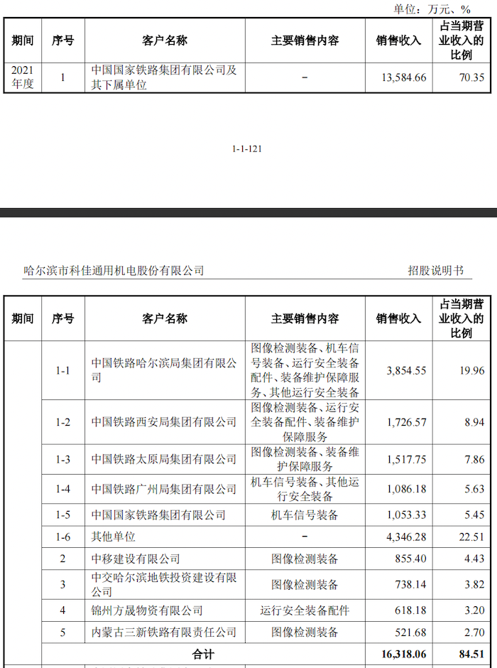 报告期内,科佳股份前五名客户的销售收入合计额占同期营业收入的比例分别为89.11%、85.95%和84.51%,其中对国铁集团及其下属单位的销售收入占比分别为71.21%、61.70%和70.35%。