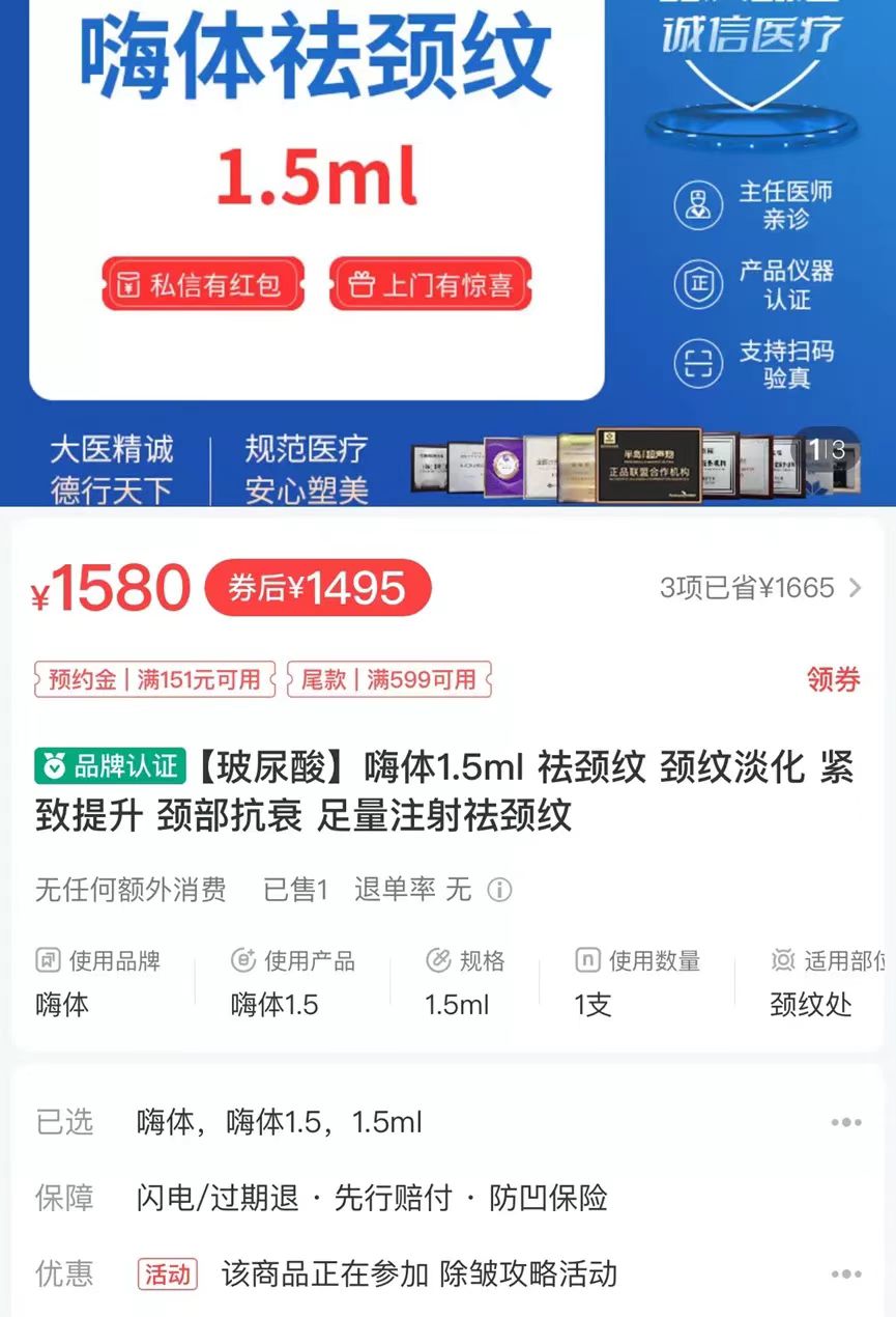 医美到底有多“暴利”?以嗨体为例,招股书显示:2019年一支嗨体的成本为24.72元,但平均售价为352.61元。经过层层加价,这款产品到了消费者手里,价格上涨更是数十倍。从某互联网医美平台搜索可知,一支1.5ml的嗨体价格是1580元,相较一年前已经大幅降价。但是,这款产品作用周期是9个月左右,需定期护理才能保持效果,换言之只要一使用就可能停不下来了,这才是最暴利的地方。