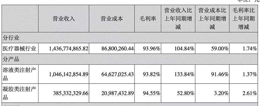 财报显示,过去一年,爱美客业绩表现十分亮眼,营收实现14.48亿元,同比增长104.13%;实现净利润9.57亿元,更是同比增长120.89%。尤其在净利润方面,爱美客首次超过了另一家玻尿酸龙头公司华熙生物。