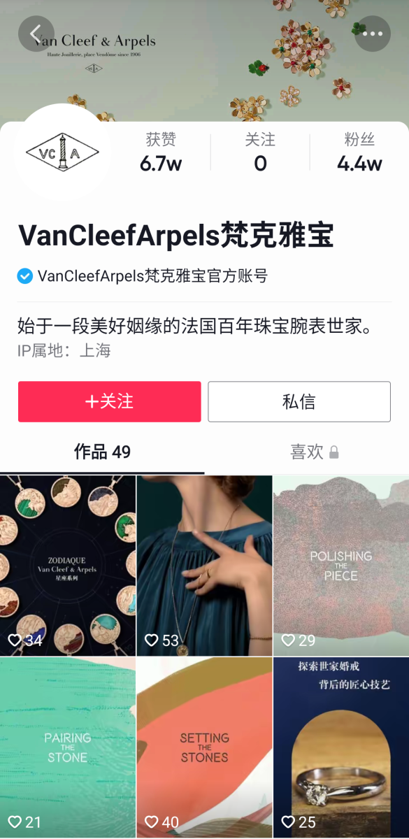 今年1月21日,梵克雅宝正式入驻抖音平台,该账号目前已获得 4.4万粉丝关注。