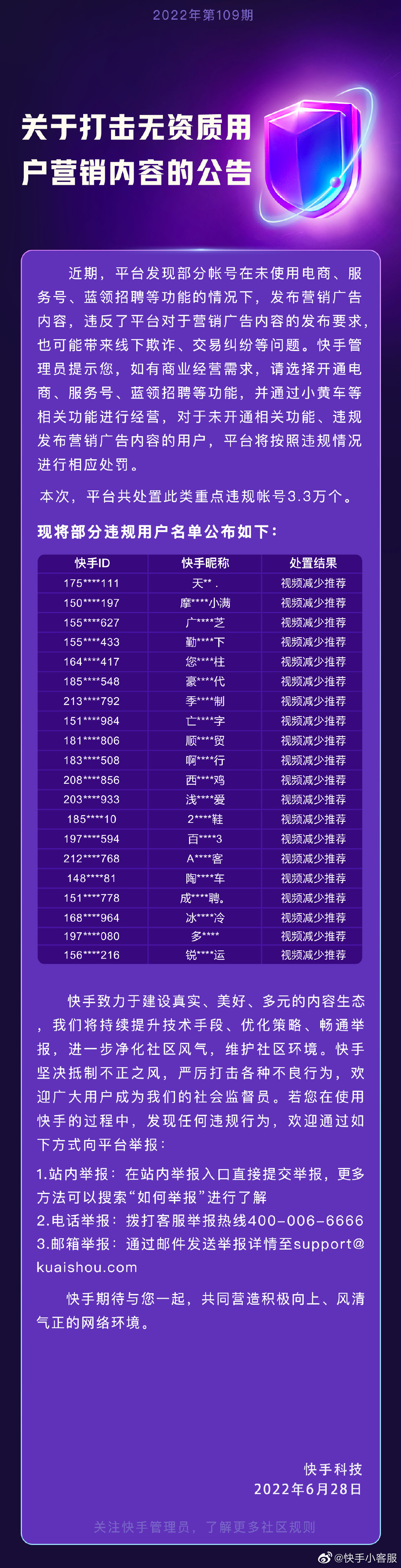 @快手小客服 微博28日发布关于打击无资质用户营销内容的公告称,近期,平台发现部分帐号在未使用电商、服务号、蓝领招聘等功能的情况下,发布营销广告内容,违反了平台对于营销广告内容的发布要求,也可能带来线下欺诈、交易纠纷等问题。