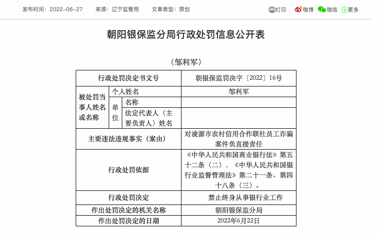 近日,辽宁银保监局官网披露的罚单显示,邹利军对凌源市农村信用合作联社员工诈骗案件负直接责任,被禁止终身从事银行业工作。