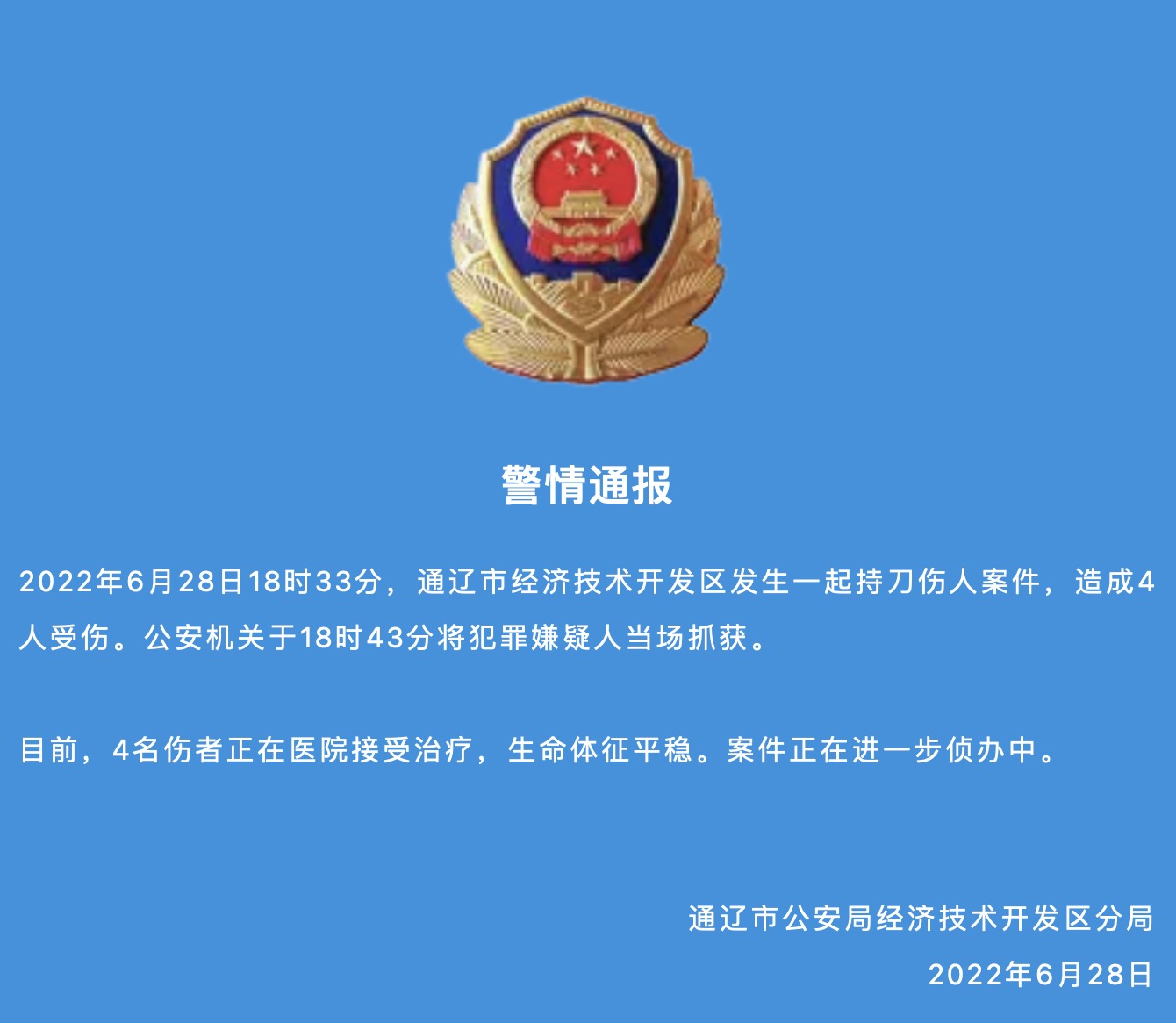 据“平安通辽”微信公众号消息,通辽市公安局经济技术开发区分局6月28日发布警情通报称,2022年6月28日18时33分,通辽市经济技术开发区发生一起持刀伤人案件,造成4人受伤。公安机关于18时43分将犯罪嫌疑人当场抓获。