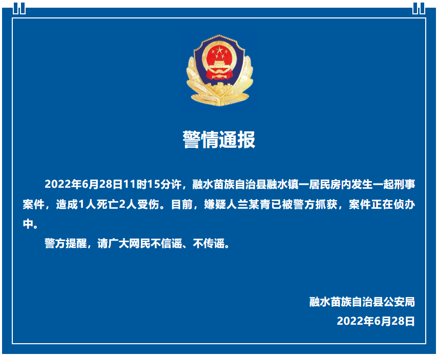 “融水警方”微信公众号消息,6月28日,广西融水苗族自治县公安局通报,6月28日11时15分许,融水苗族自治县融水镇一居民房内发生一起刑事案件,造成1人死亡2人受伤。目前,嫌疑人兰某青已被警方抓获,案件正在侦办中。