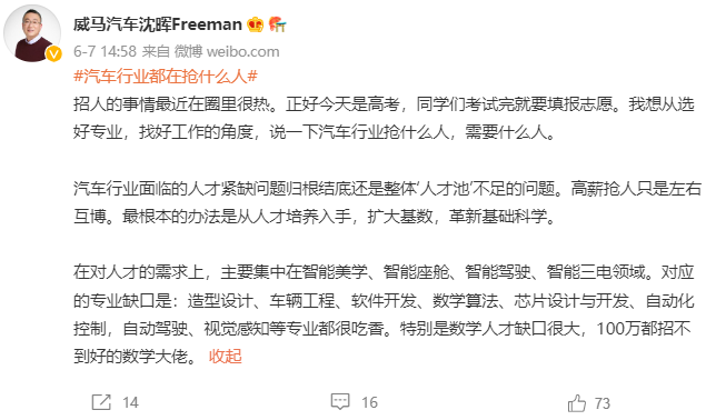 在汽车行业,人才紧缺是客观事实,虽然造车新势力左手在裁员,但右手又开始招应届生。威马汽车CEO沈晖喊话,说汽车行业面临“人才池”问题,100万都招不到数学大佬。