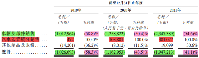2021年威马汽车的毛损率已经降到41.1%(卖积分所致的降低),但车辆销售的毛损率同比增加4.2个百分点到54.6%,毛损为23.5亿,形势不容乐观,这意味着威马每卖一辆车就要亏钱。以2021年4.42万的销量计算,买一辆亏5.3万。