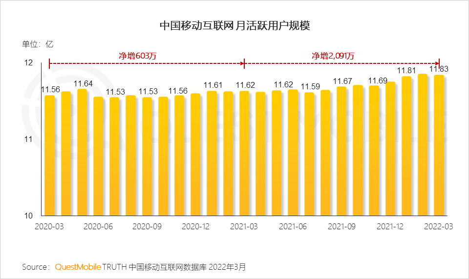 但其实事实是,移动互联网的流量目前还没有完全见顶,甚至还在增长之中。根据QuestMobile数据显示,2022年一季度,移动互联网甚至迎来了一次流量增长小高峰,截至3月末,月活跃用户规模达到11.83亿,月人均使用时长达到了162.3小时,月人均使用次数达到了2,637.1次,同比分别增长了12.1%、4.4%,用户时长同比增长再次重回两位数。