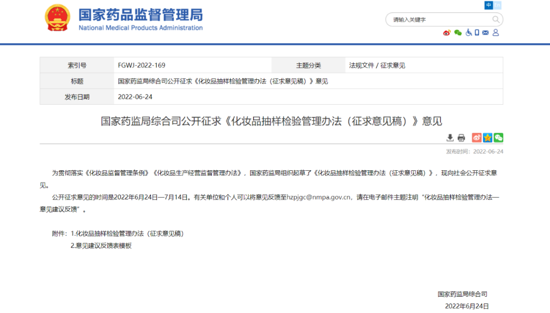 6月24日,国家药品监督管理局综合司发布了公开征求《化妆品抽样检验管理办法(征求意见稿)》(下称《办法》意见稿),此举意在贯彻落实《化妆品监督管理条例》《化妆品生产经营监督管理办法》。