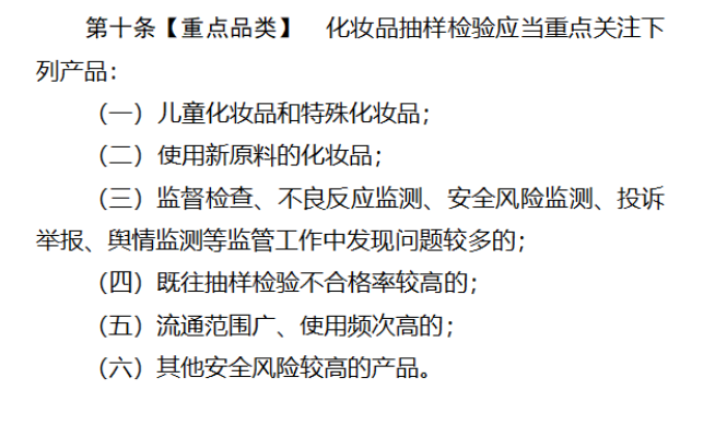 此次发布的《办法》意见稿,在上一版本的基础上做了细微的调整,再次强调儿童化妆品和特殊化妆品是抽样重点。除此之外,使用新原料的化妆品,也在重点之列。
