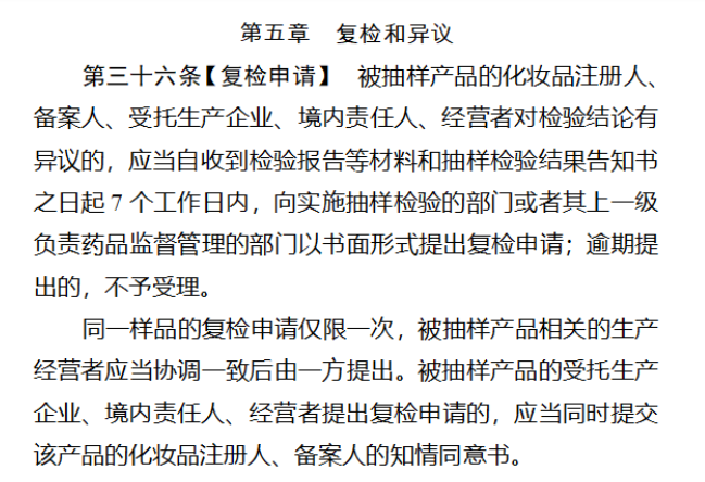 化妆品生产经营者若对抽检结果有异议,《办法》意见稿也给出了解决办法,第三十六条提及,自收到抽检结果告知书之日起7个工作日内,以书面形式提出复检申请;逾期提出的,不予受理。与此同时,被抽样产品的受托生产企业、境内责任人、经营者提出复检申请的,还需取得化妆品注册人、备案人的知情同意书。