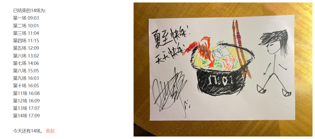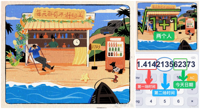 在八道试题中,第一二天的试题难度最低。第一题是总结免单时刻规律,得出其分钟位的数字呈圆周率依次排列;第二题由歌手周深作画出题,时间线索基本都隐藏在画作中,答案也很明显。由于这两场参与人数少,因此免单名额也未设上限。