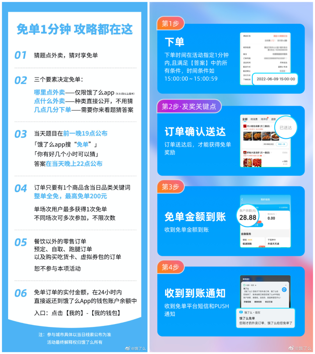 饿了么“免单一分钟”活动整体以猜题的形式展开,除第一天外,活动题目会在前一天晚22:05左右发布,用户只需猜对试题中隐藏的时间点,并在对应时刻1分钟内下单即有机会获取免单,免单金额最多200元。值得注意的是,部分题目还对下单地区进行了规定,这就需要用户在猜题时保持对各类线索的敏感,通过理性分析得出答案。