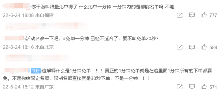 另外,饿了么声称“免单一分钟”,却在后期添加名额限制,导致30秒以后下单的用户基本失去免单的机会,也引起了大批用户的不满,称其“名不副实”,要求更改活动规则。