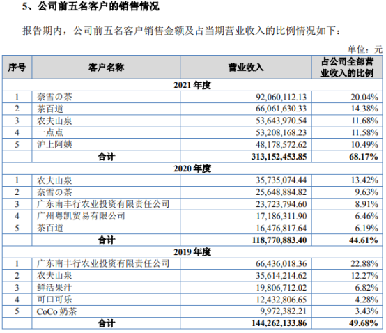 之后是田野股份IPO。他的主要产品是原料果汁、速冻果块、鲜果等,奈雪的茶、茶百道、一点点和沪上阿姨都跻身其前五大客户,并为田野股份贡献了56.49%的营收。