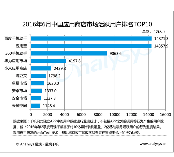 日前,Analysys易观发布了 《2016年上半年中国应用商店市场用户数据监测报告》,数据显示,2016年6月份中国应用商店市场月活跃用户数排在市场前五名的分别为百度手机助手、应用宝、360手机助手、华为应用市场和小米应用市场,其月活跃用户分别为14371.3万人、14357.9万人、9063.6万人、4197.8万人和2439.8万人。从该排名来看,应用分发市场基本形成两大阵营,互联网阵营依然是百度系、腾讯系、360等互联网巨头的主战场;手机厂商阵营里,华为应用市场异军突起,月活率赫然排列第一。