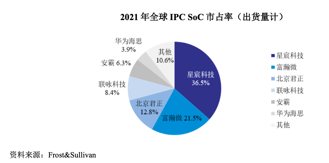 根据Frost&Sullivan数据,以出货量口径计算,2021年全球IPC SoC市场份额排名前五的供应商合计占据85.5%的市场份额,星宸科技以36.5%排名第一,远超第二富瀚微15个百分点;2021年全球NVR SoC市场份额排名前四的供应商合计占据97.7%的市场份额,星宸科技以38.7%仍然排名第一,远超第二富瀚微10余个百分点。