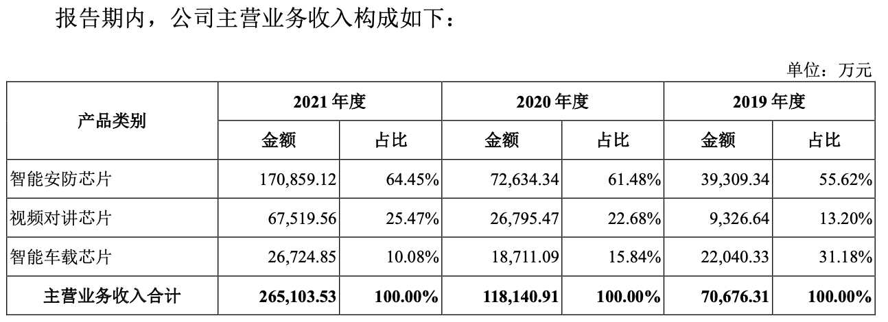 2019年-2021年,公司的营业总收入分别为7.11亿元、11.93亿元和26.86亿元,净利润分别为6314.92万元、2.17亿元以及7.54亿元,其中智能安防芯片贡献半壁江山,视频对讲芯片收入快速提高。