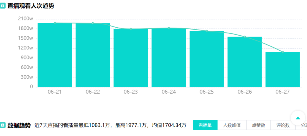 就直播观看人数而言,东方甄选自6月21日起至6月27日,最高看播量1977.1万人次,最低1083.1万人次,近乎减半。