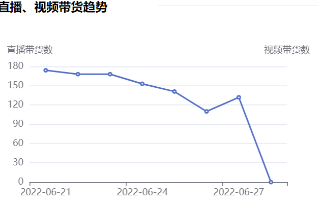 以最近爆火的东方甄选账号的数据为例,据抖怪兽数据显示,6月21日至6月27日,东方甄选直播带货数量整体呈下降趋势,从6月21日的174件下降到了6月27日的132件,其中6月26日最低值为110件。