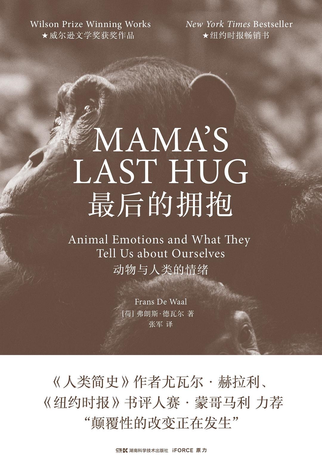《最后的拥抱》一书探索了动物的情感世界,以动物学教授简·范·霍夫与黑猩猩首领“大妈妈”的关系为线索展开。霍夫教授与“大妈妈”相识40年,2016年,将近59岁的妈妈濒临死亡,霍夫教授向她道别,当他蹲下身子走向生病的“大妈妈”时,她伸手摸了摸他的头。“她轻轻抚摸他的头发,”霍夫的学生,如今已是灵长类动物行为学教授的德瓦尔回忆道,“把他拉得更近了。 她的手指有节奏地拍打他的后脑勺和脖子,向她的朋友保证,靠得这么近是可以的。”他们的拥抱被摄像机记录了下来,一时在网上引起轰动,人们发现黑猩猩表达友好的方式竟然与我们如此相似。德瓦尔从此出发,在书中深入探索了动物的情感领域,他驳斥了情感领域中人类例外论的观点,指出人类和动物本质上是相通的。
