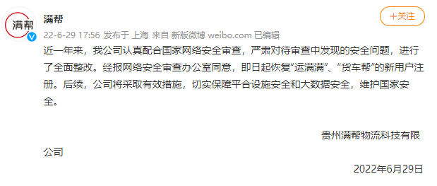 满帮6月29日在官方微博发布公告称,近一年来,公司认真配合国家网络安全审查,严肃对待审查中发现的安全问题,进行了全面整改。经报网络安全审查办公室同意,即日起恢复“运满满”“货车帮”的新用户注册。后续,公司将采取有效措施,切实保障平台设施安全和大数据安全,维护国家安全。