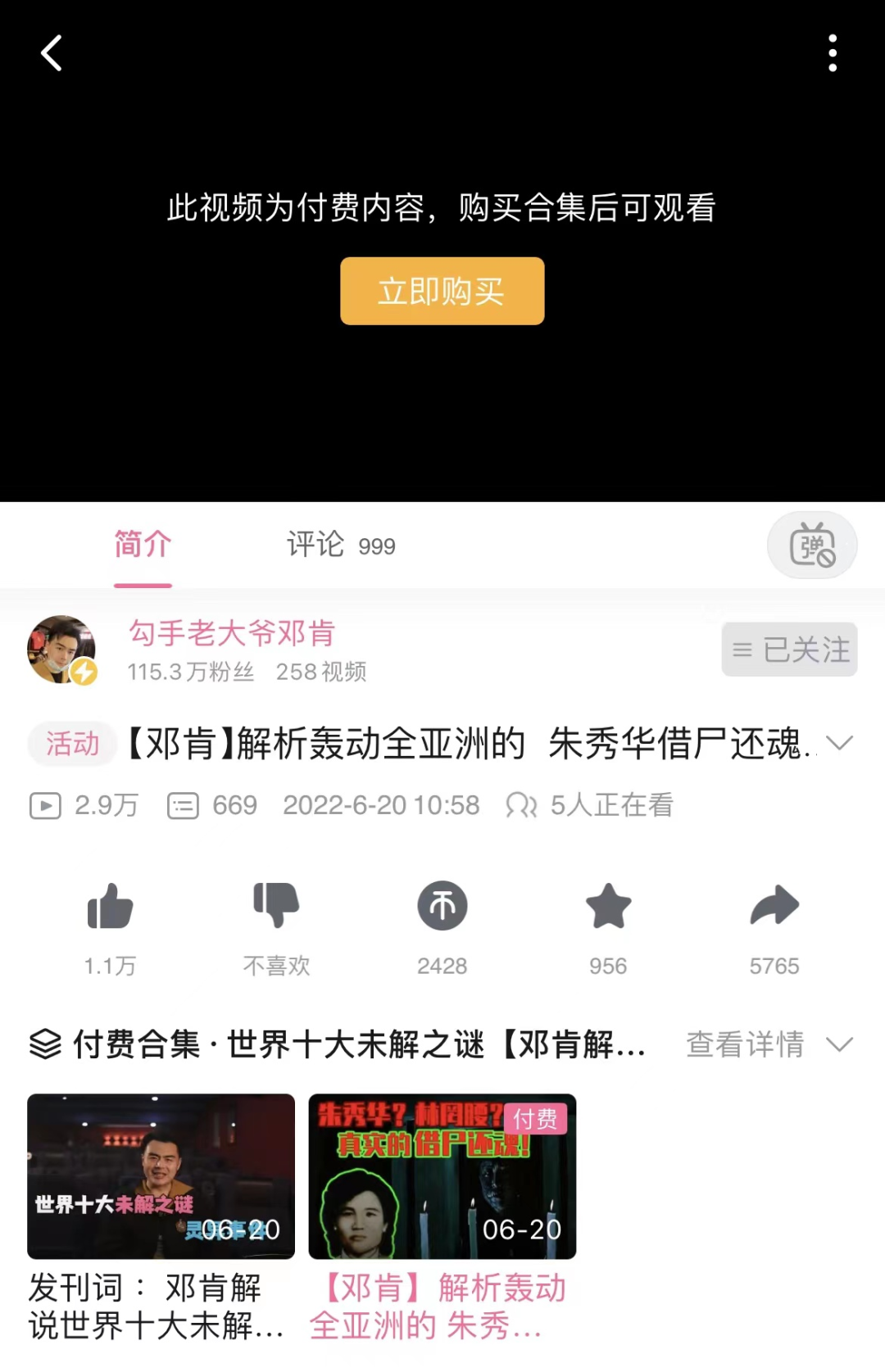 6月20日,B站UP主@勾手老大爷邓肯 推出“世界十大未解之谜”系列付费视频,售价30元,共10集,目前播放量2.9万。