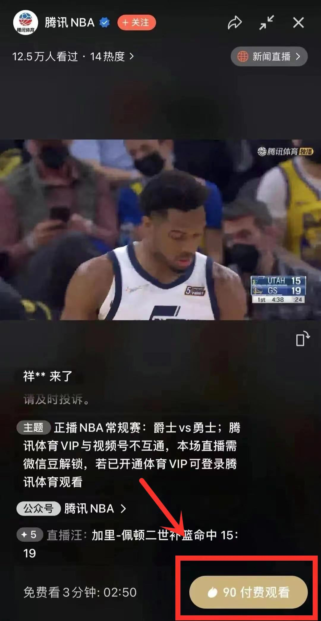 此外,视频号还在今年1月份推出首个付费直播间,直播内容为NBA常规赛,进入直播间后,用户可免费观看3分钟,3分钟后需支付90个微信豆(1元=10个微信豆)才能继续观看。视频号通过前置付费行为的方式,在慢慢引导观众付费观看内容的习惯。