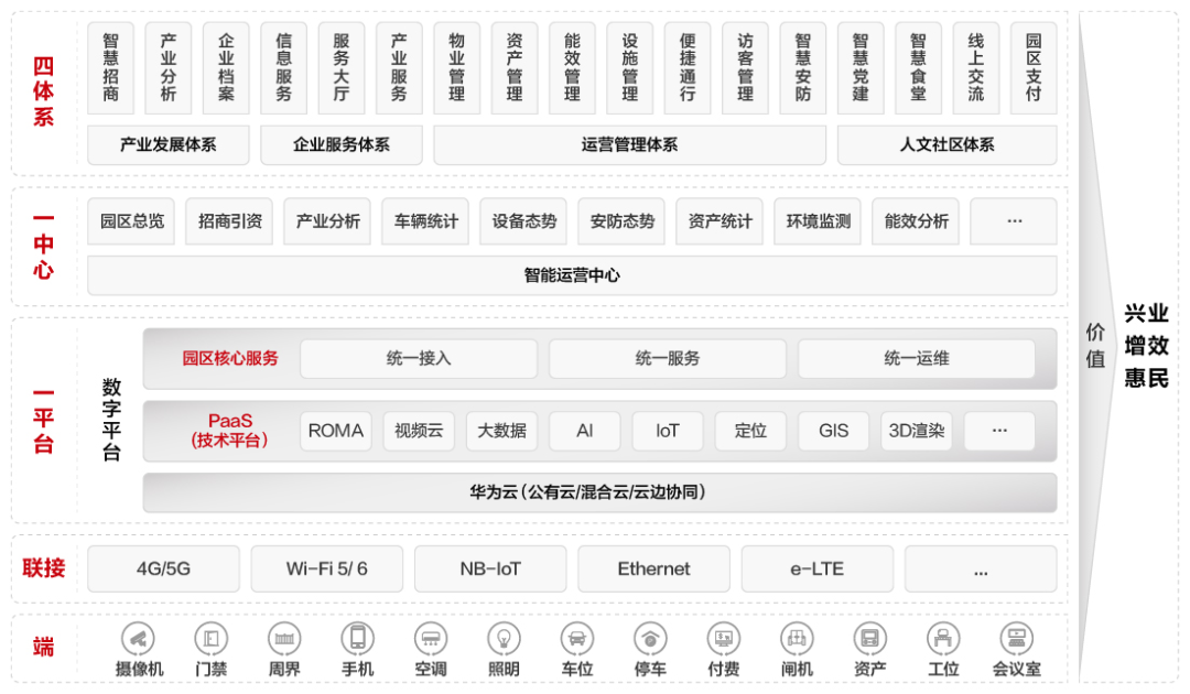而在园区数字化的进程中,格外需要灵活机动的配合。横向来看,数字化需要在感知层、传输层、支撑层、应用服务层都进行全面数转智改,涉及网络、电力、云、硬件、软件等多种能力;纵向来看,园区发展至今已经形成了多种业态,各类园区的数字化需求既有共通点,也有差异性,需要个性化、深度融合的解决方案。