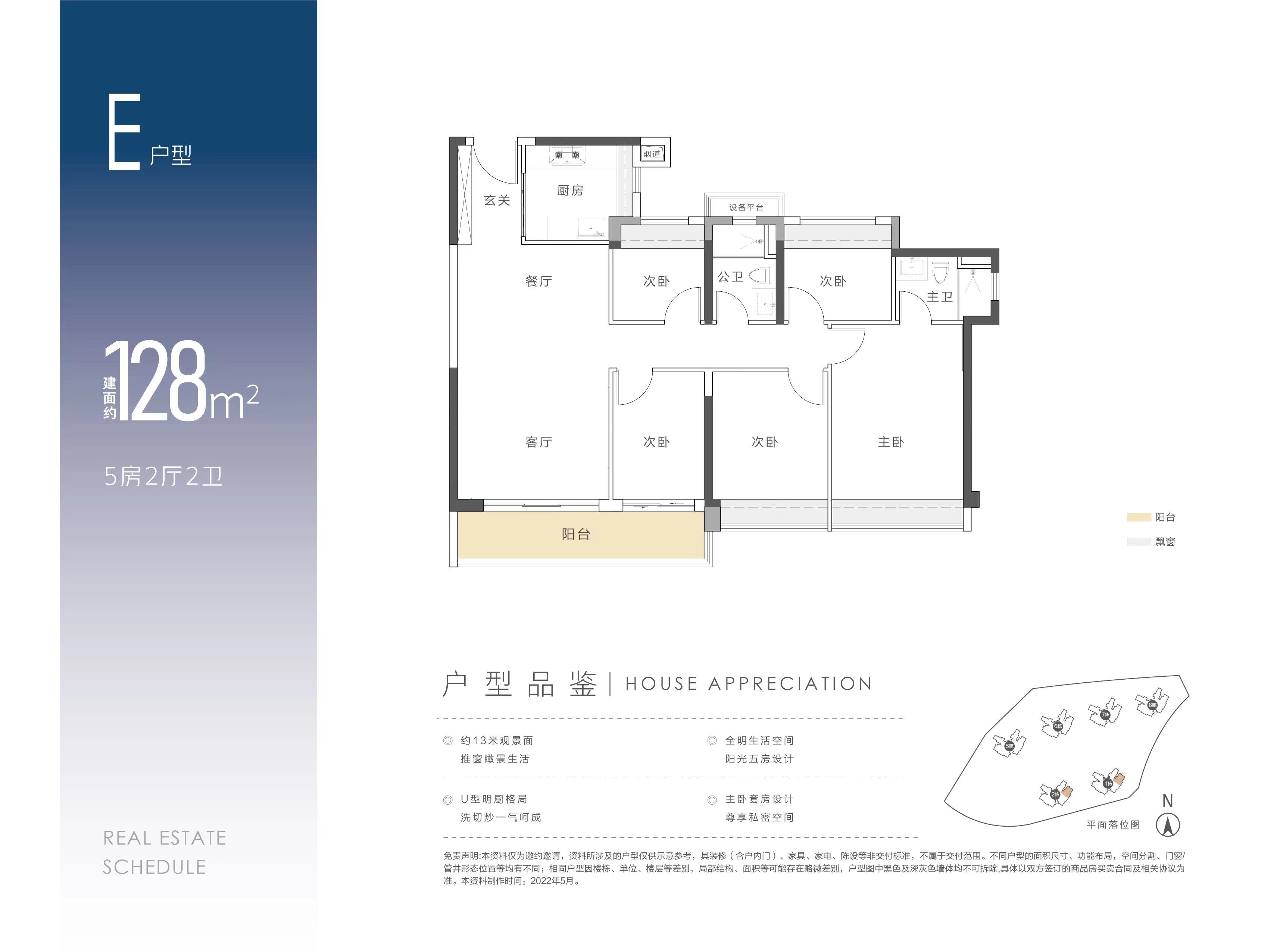 建面约128平方米的为五房两厅两卫,这个户型带有一个连通客厅和次卧的超长阳台。
