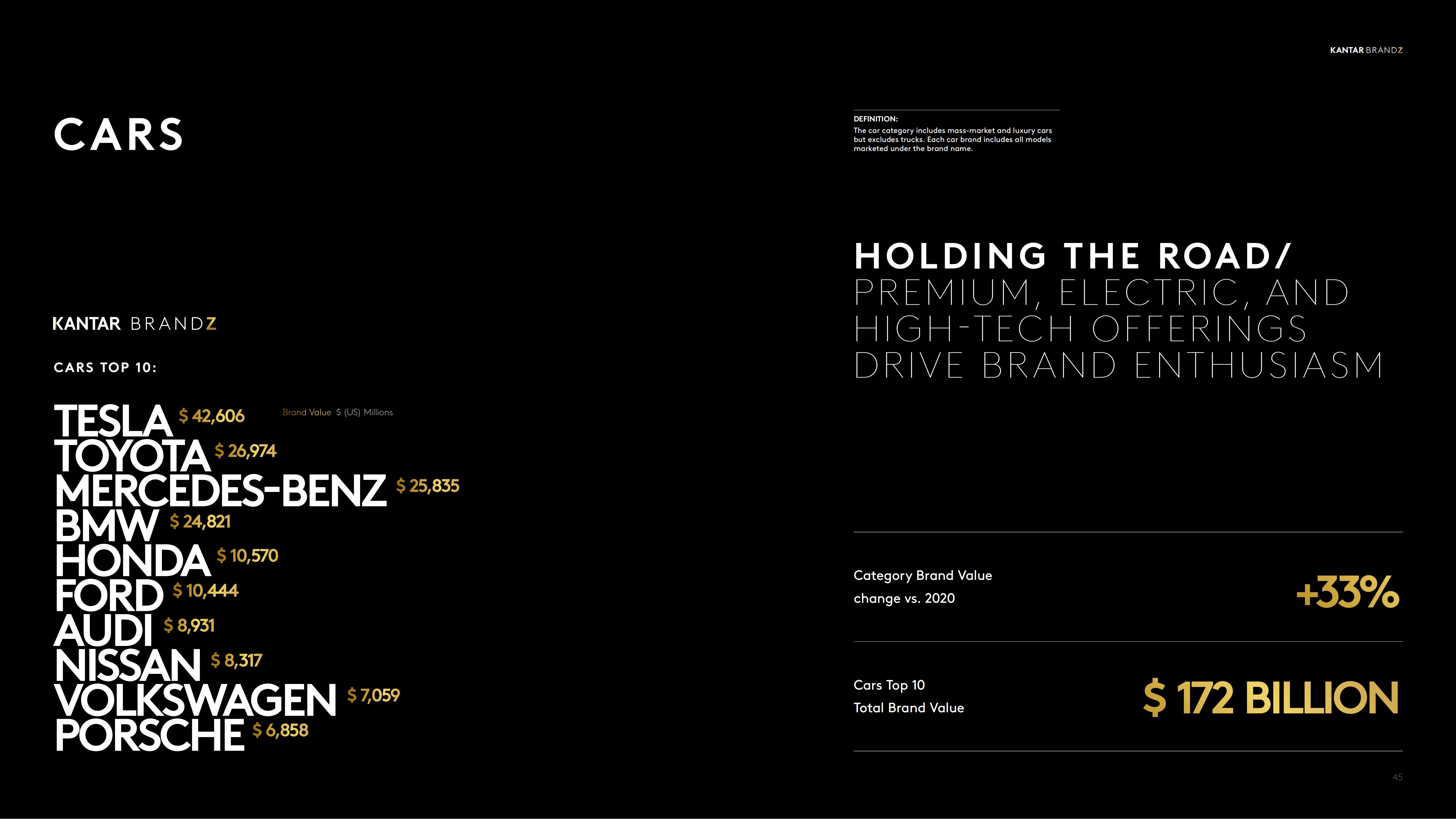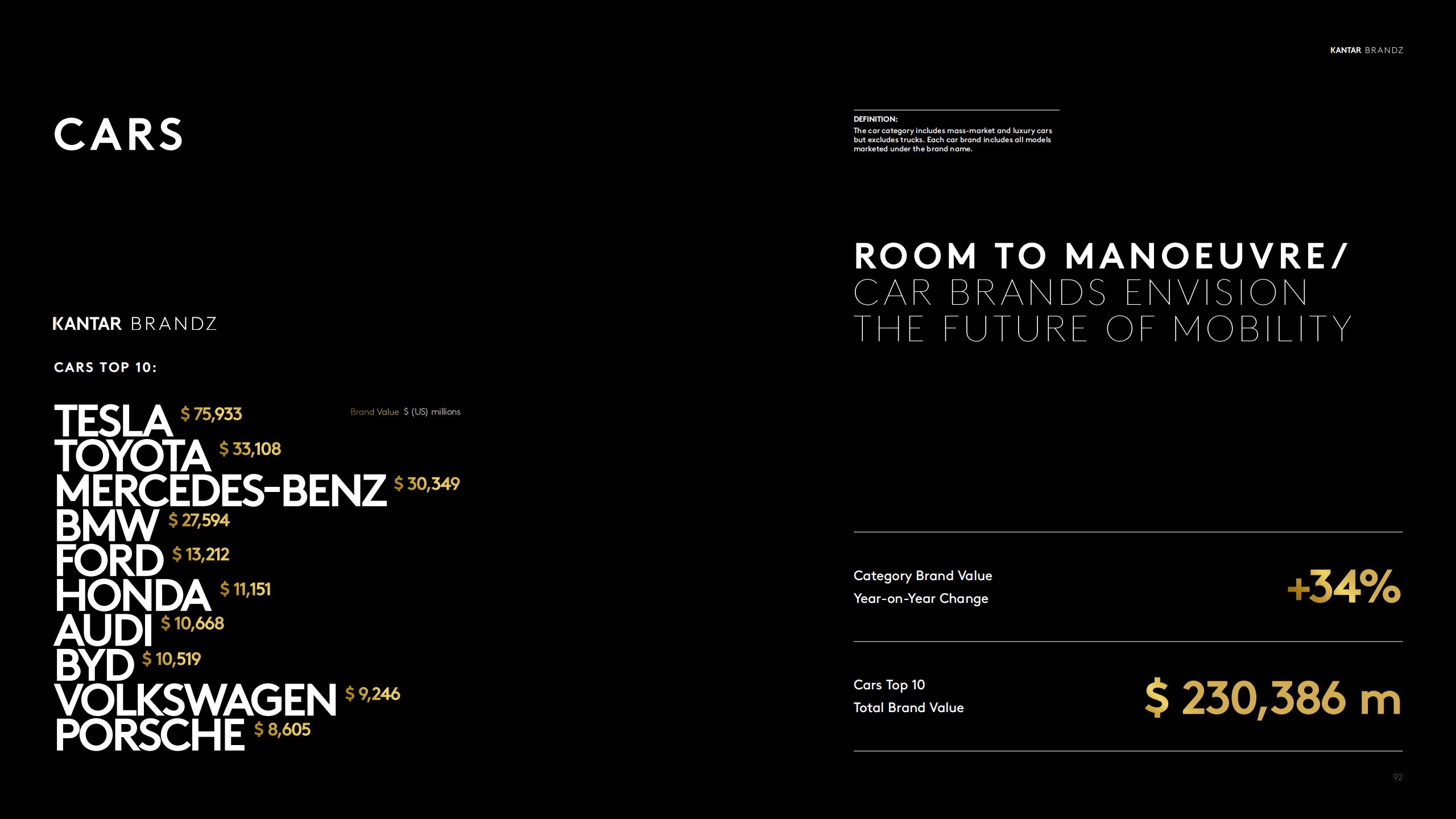英国洞察与咨询公司凯度近期发布了Brand Z 2022年世界品牌价值评估报告。报告指出,2022年汽车品类品牌总价值同比上涨34%,品类前十品牌价值超2300亿美元。