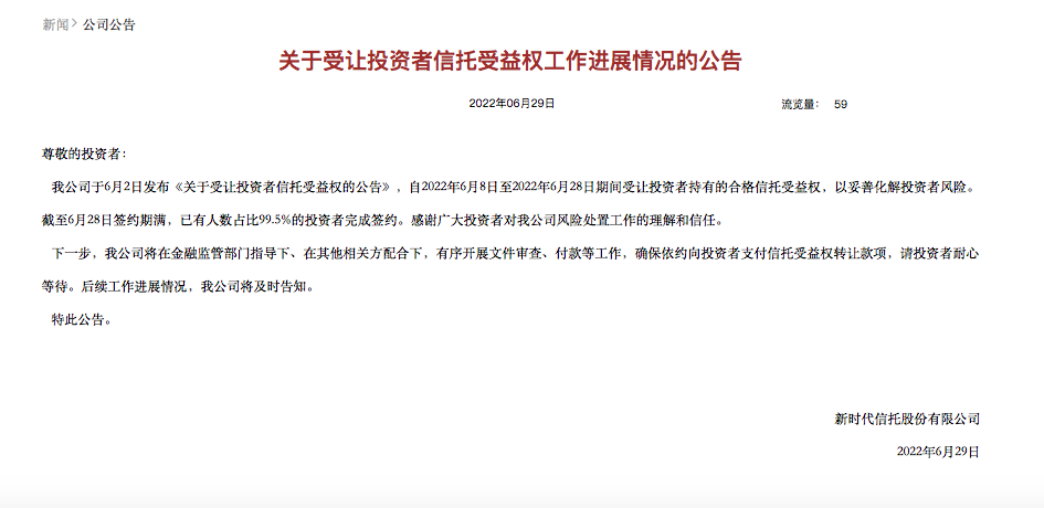 6月29日,被接管的新时代信托在其官网发布《关于受让投资者信托受益权工作进展情况的公告》称,截至6月28日签约期满,已有人数占比99.5%的投资者完成签约。