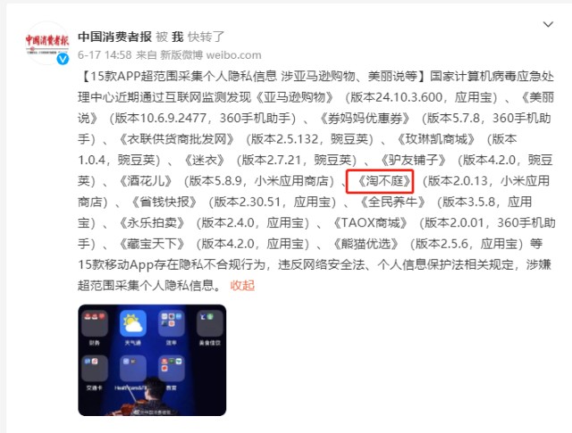 近日,国家计算机病毒应急处理中心通过互联网监测,发现15款移动App存在隐私不合规行为,违反网络安全法、个人信息保护法相关规定,涉嫌超范围采集个人隐私信息。其中,《淘不庭》(版本 2.0.13,小米应用商店)等八款 App 未向用户告知个人信息处理者的名称或者姓名和联系方式,或处理的个人信息种类、保存期限,涉嫌隐私不合规。